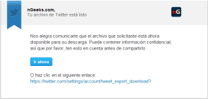Para descargar los tweets hay que entrar en la Configuración de tu perfil a través de Twitter.com y pinchar en “Solicita tu archivo” al final de la página. Una vez seguidos los pasos que os indicamos, recibiréis un e-mail con un enlace para la descarga de un archivo .zip que contiene todos vuestros tweets en formato HTML.